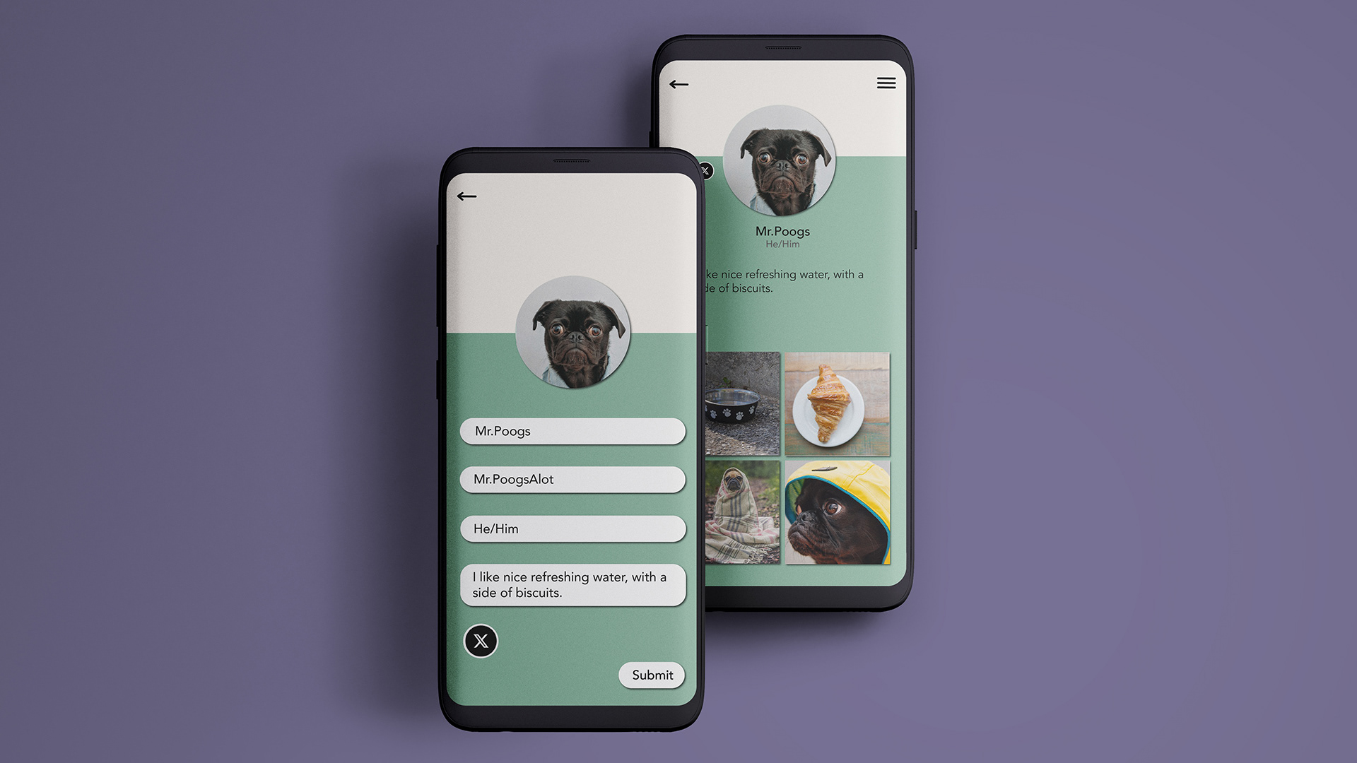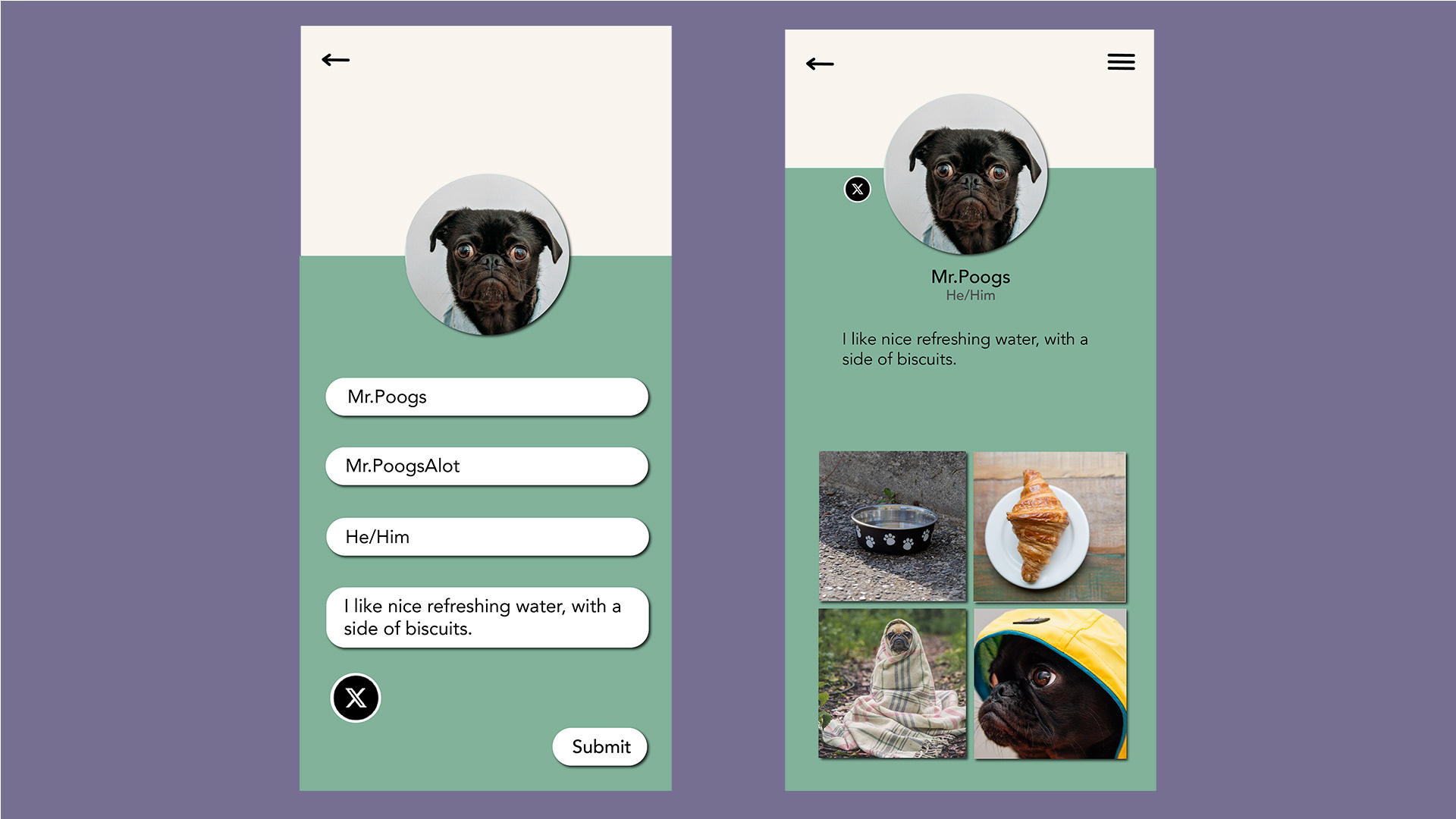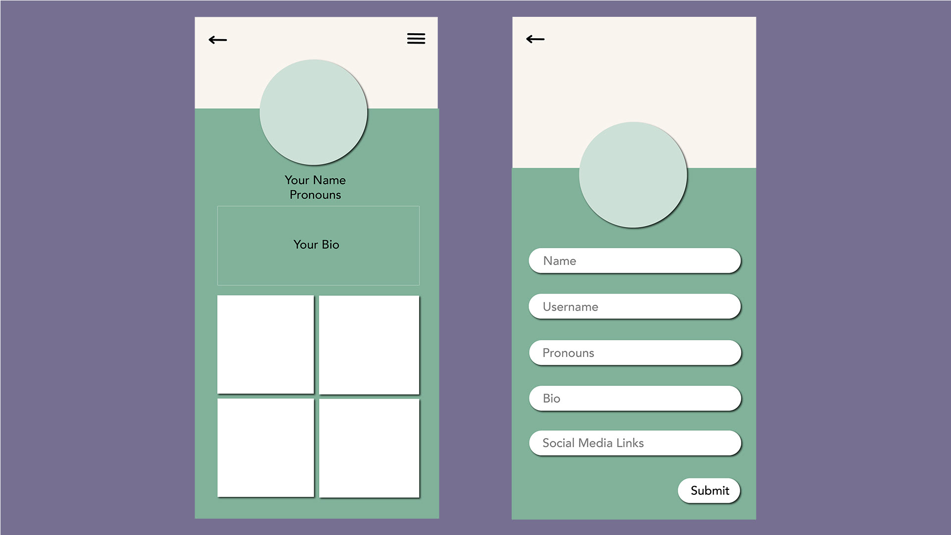Here I decided to make a social media profile. I have it showcasing the main page of the users profile alongside what it looks like with them editing their own information that would be displayed on their profile.